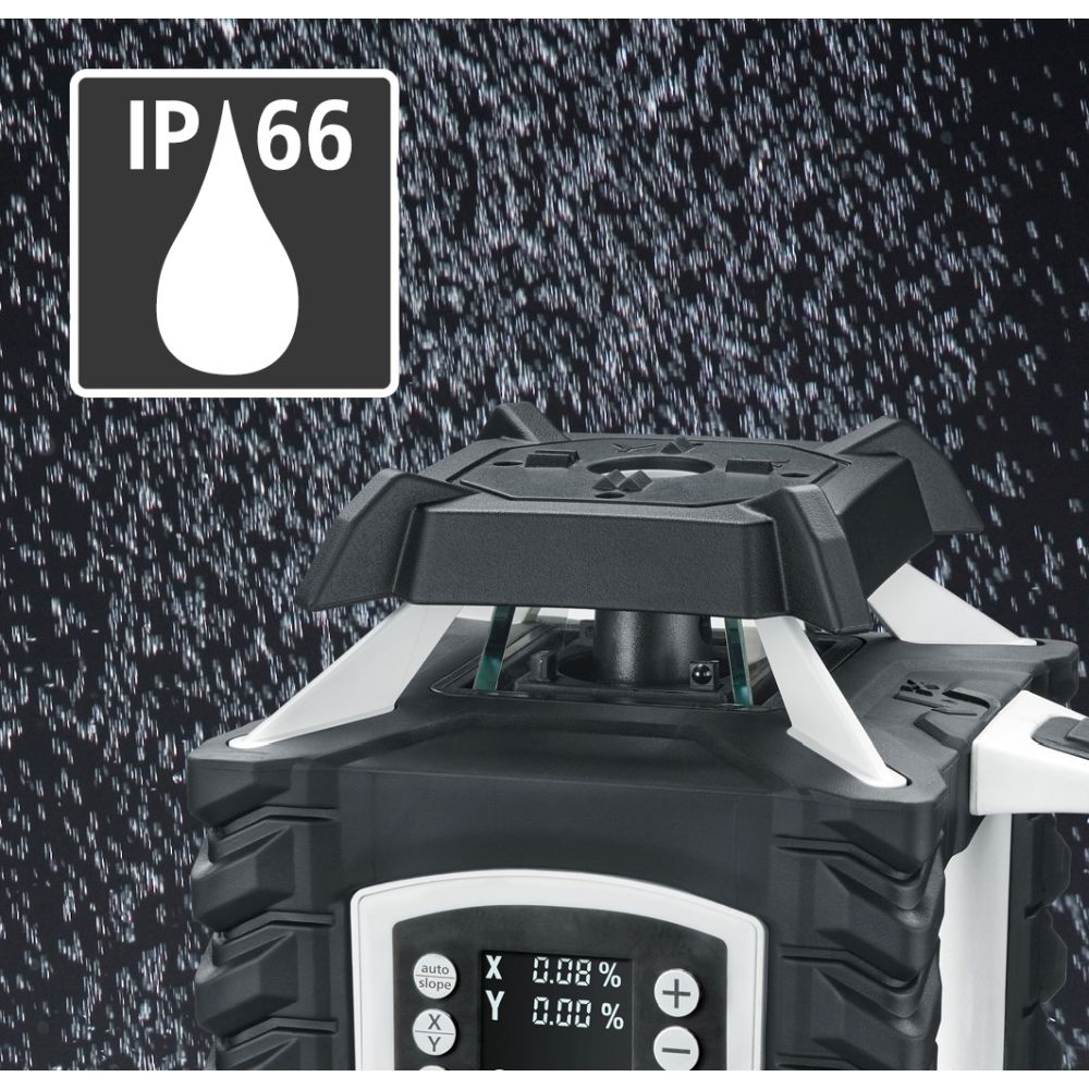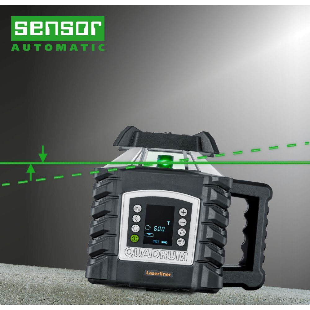 Descripción: Este láser de rotación totalmente automático utiliza tecnología láser verde y es perfecto para trabajos de alineación precisos en el plano horizontal y vertical. Para trabajos en pendiente, el plano horizontal se puede inclinar digitalmente en dirección X e Y. La inclinación de los ejes X e Y se muestra concretamente en porcentaje en la pantalla del láser y del mando a distancia. Las pendientes de hasta 6° se aplican automáticamente mediante la función de inclinación motorizada, mientras que las inclinaciones mayores se pueden ajustar manualmente o con una placa angular opcional. Con la función de seguimiento, el láser giratorio se alinea con el receptor milimétrico. Para ello, el receptor dirige automáticamente el rayo láser a la posición cero mediante transmisión por radio. La función de seguimiento puede utilizarse para alinear un plano vertical, por ejemplo, para colocar un separador de habitaciones. La función de seguimiento también hace que la nivelación horizontal sea más fácil, rápida y precisa para una amplia gama de aplicaciones, como trabajos en patios y exteriores o la preparación de cimientos. Esto resulta especialmente útil para proyectos que requieren gran precisión y eficacia. La función AntiShake permite una rápida configuración en superficies vibrantes y con viento, una ventaja decisiva para obtener resultados fiables en condiciones de obra exigentes.