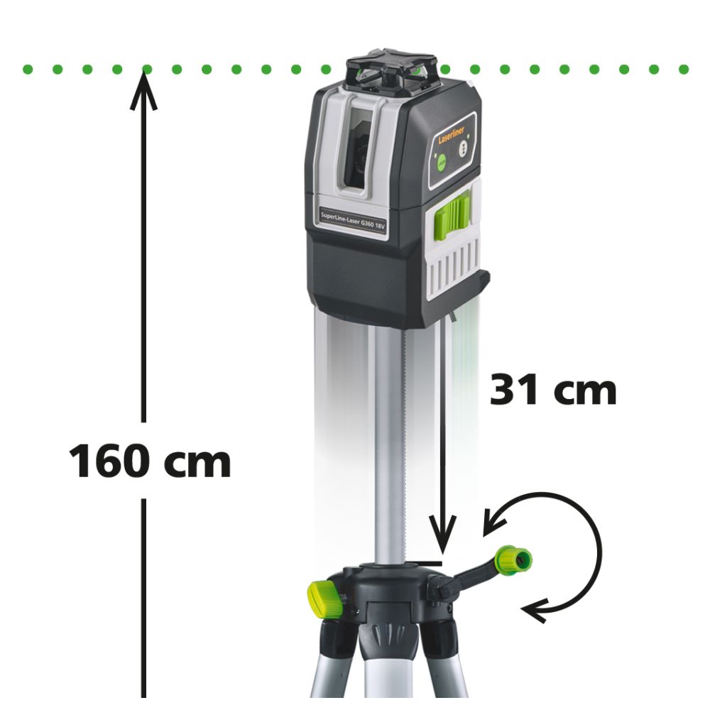 Láser verde de líneas cruzadas con círculo láser horizontal, línea láser vertical y trípode compacto de 150 cm: compatible con sistemas de baterías de 18 V de fabricantes conocidos, material reciclado sostenible