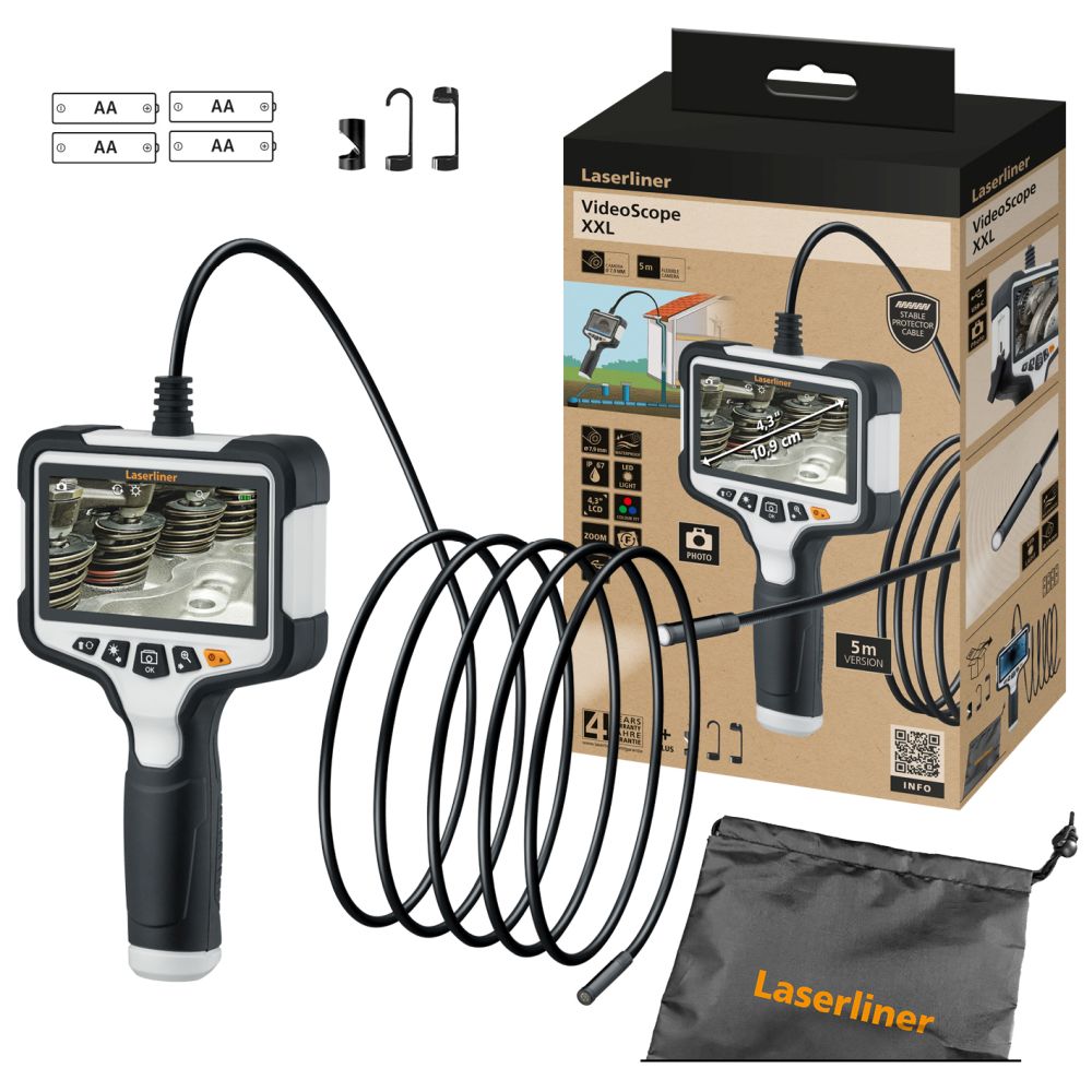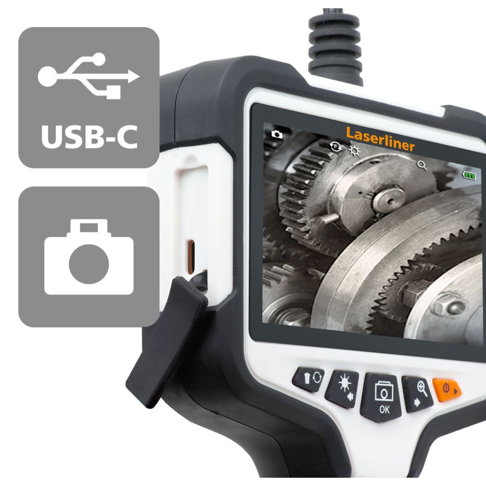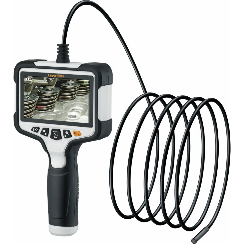 Descrizione: Questo pratico sistema di ispezione video con comandi intuitivi consente di eseguire semplici indagini visive di punti difficilmente raggiungibili come condotte, controsoffitti e veicoli. Grazie al suo diametro estremamente ridotto, la testa della telecamera impermeabile, resistente a benzina e gasolio, è la soluzione ideale per piccole aperture, perfetta per ispezionare macchine, motori e zone ristrette. Grazie alla sua lunghezza, è possibile usarla anche a grandi distanze. Sei LED ad alta potenza sulla telecamera offrono un’efficiente illuminazione degli oggetti. L’immagine viene visualizzata mediante rotazione e funzione speculare da diverse prospettive sul display a colori da 4,3" TFT di facile lettura. Il doppio zoom consente un riconoscimento dei dettagli ancora più preciso. Con gli accessori magnetici e a gancio si possono serrare o sollevare oggetti difficilmente raggiungibili, mentre lo specchio consente di osservarli con un’angolazione di 90°. Quindi è possibile memorizzare le riprese in una memoria immagini interna. L’involucro, realizzato in gran parte con plastica riciclata, offre un prezioso contributo alla sostenibilità.
