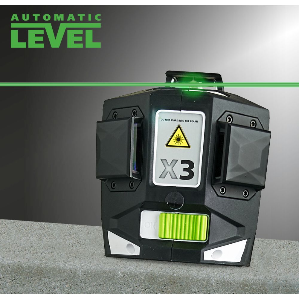 Dreidimensionaler Laser mit drei grünen 360°-Laserkreisen und magnetischer Klemm- und Wandhalterung