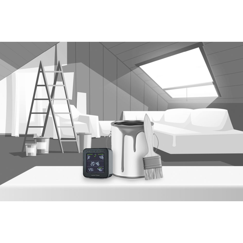 Description: This VOC measuring device has an extremely accurate sensor manufactured by the Swiss company Sensirion. It determines and evaluates the concentration of volatile organic compounds (VOCs). The product’s display includes the calculated eCO₂ content, humidity, temperature and time. At high concentrations of VOCs and eCO₂ which have a negative effect on well-being and health, the user receives a ventilation recommendation in the form of a numerical display, an optical signal, and a switchable acoustic signal. This provides effective health protection against VOC exposure in indoor atmospheres such as when using cleaning products, varnishes, paints and synthetic materials, or when painting or sanding.