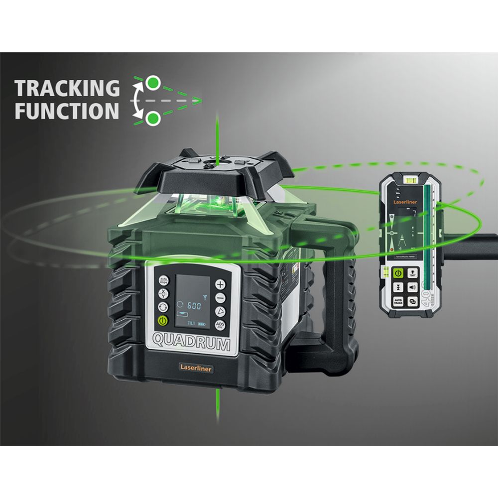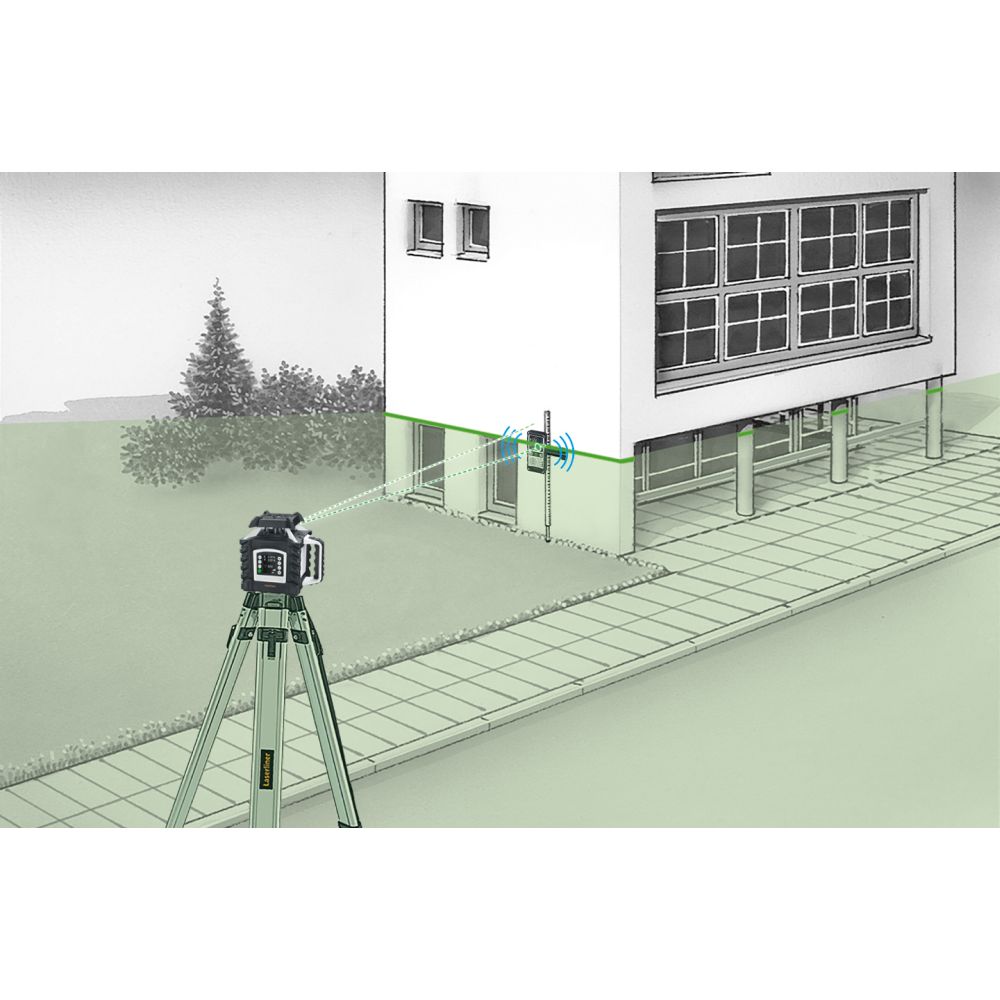 Description: This fully automatic rotary laser with green laser technology is perfect for precise alignment work in the horizontal and vertical planes. For gradient work, the horizontal plane can be digitally tilted in the X and Y directions. The tilt of the X and Y axes is displayed precisely as a percentage on both the laser and remote-control displays. Gradients of up to 6° are implemented automatically via the motorised Tilt function; steeper gradients can be set manually or with an optional angle plate. In the Tracking function, the rotary laser aligns itself to the millimetre receiver. For this purpose, the receiver controls the laser beam to the zero position automatically via radio transmission. Using the Tracking function, a vertical plane can be aligned, for example when setting out a room divider. The Tracking function also makes horizontal levelling easier, quicker and more precise in many applications, for example on terrace and exterior work or when preparing foundations. This is particularly helpful in projects that require high precision and efficiency. The AntiShake function allows a fast set-up on vibrating surfaces and in windy conditions, a decisive advantage for reliable results under demanding site conditions.